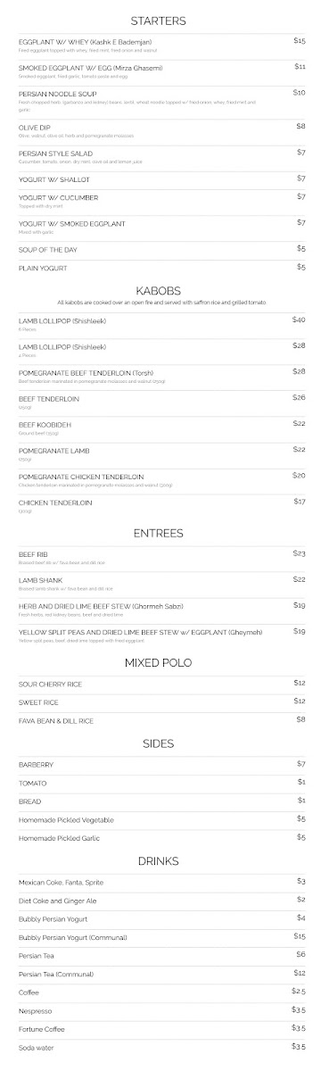 The heart of the menu is the kabob lineup, where choices like LAMB LOLLIPOP (Shishleek) and BEEF KOOBIDEH feel classic, while the tangy pomegranate-forward plates-POMEGRANATE BEEF TENDERLOIN (Torsh) and POMEGRANATE LAMB (Lamb Torsh)-add a deeper, slightly sweet-sour punch that’s memorable. If you’re leaning toward hearty stews and slow-cooked mains, the entrees deliver with BEEF RIB, LAMB SHANK, and two Persian staples: HERB AND DRIED LIME BEEF STEW (Ghormeh Sabzi) and YELLOW SPLIT PEAS AND DRIED LIME BEEF STEW w/ EGGPLANT (Gheymeh)-both built for pairing with rice.