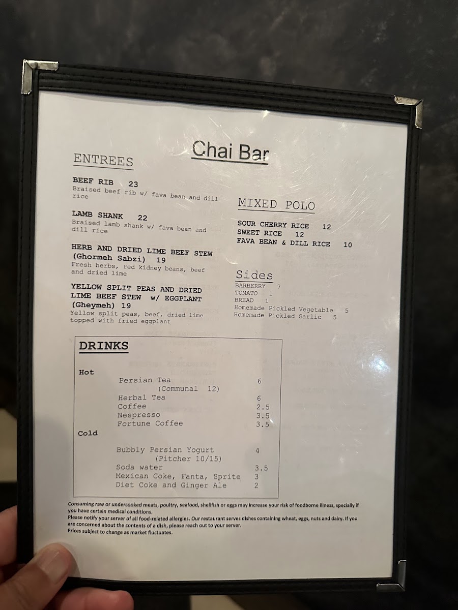 Speaking of rice, the mixed polo options-SOUR CHERRY RICE, SWEET RICE, and FAVA BEAN & DILL RICE-make it easy to customize the meal’s mood, from bright and fruity to fragrant and savory. Add simple sides like BARBERRY, TOMATO, and BREAD, plus house extras like Homemade Pickled Vegetable and Homemade Pickled Garlic, and you’ve got everything needed to round out the table. For drinks, the selection is practical and pleasing-Mexican Coke, Fanta, Sprite, Diet Coke and Ginger Ale-with Persian touches like Bubbly Persian Yogurt, Bubbly Persian Yogurt (Communal), and a warm finish from Persian Tea. Overall, Chai Bar’s menu feels focused, satisfying, and designed for people who want bold, familiar flavors without overcomplicating the experience.